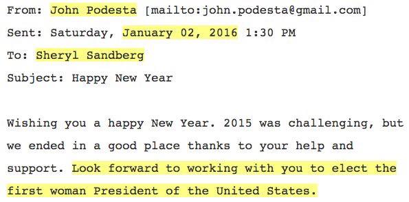 Email between Facebook CTO, Sheryl Sandberg and Hillary Clinton campaign head John Podesta, signed with Facebook's key